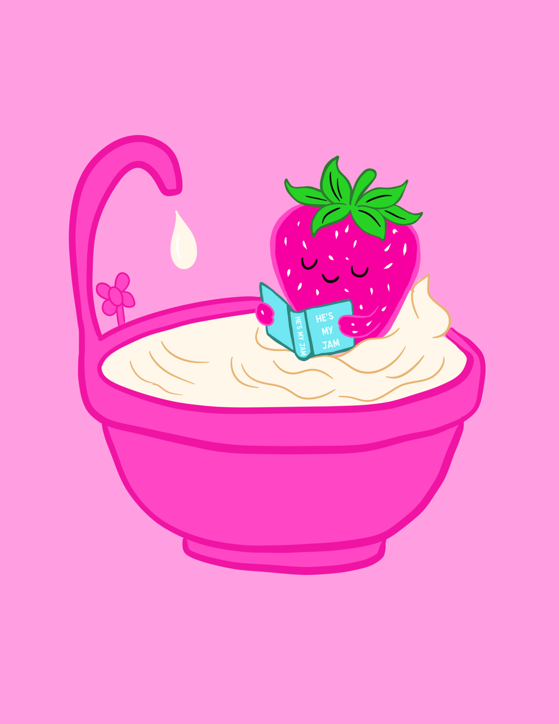 Soak up the sweetness with this berry delightful art print! Featuring a cozy strawberry character lounging in a tub full of whipped cream while reading a book titled “Hes My Jam, this illustration is the perfect blend of cute, cozy, and just a touch cheeky.