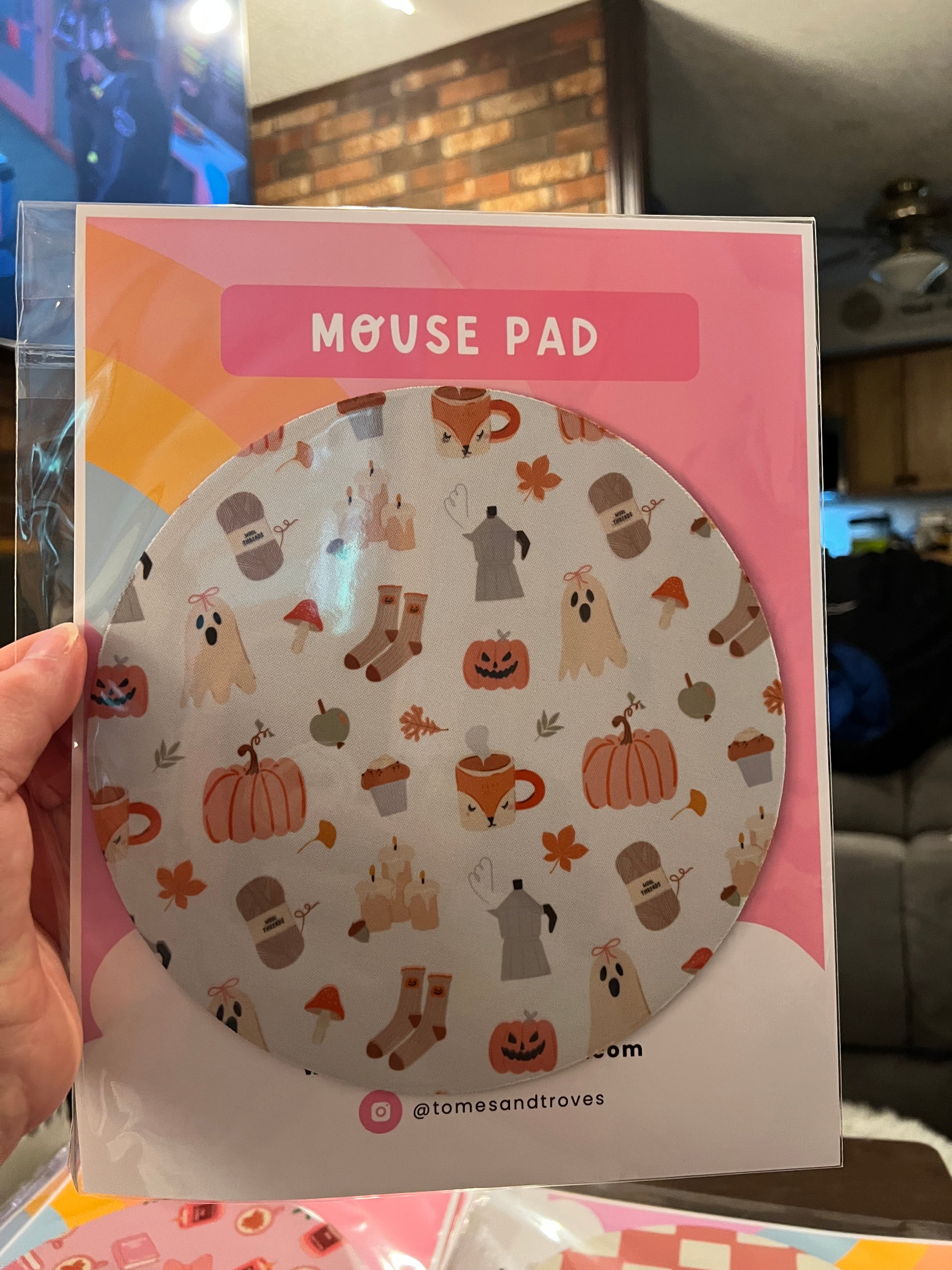 Upgrade your desk setup with our Fall-inspired round mouse pad! Covered in pumpkins, ghosts and pumpkin spice—this mouse pad brings cozy seasonal vibes to your workspace.